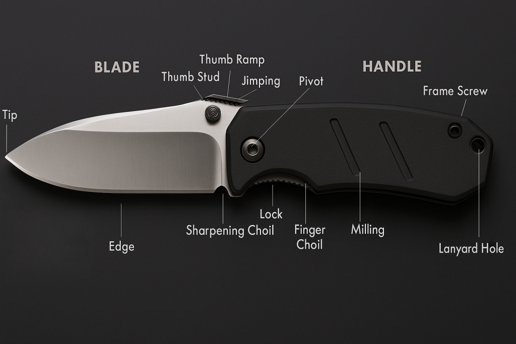 The working edge of the knife, available in shapes like drop point, clip point, and tanto. Blade steel affects edge retention, corrosion resistance, and toughness.