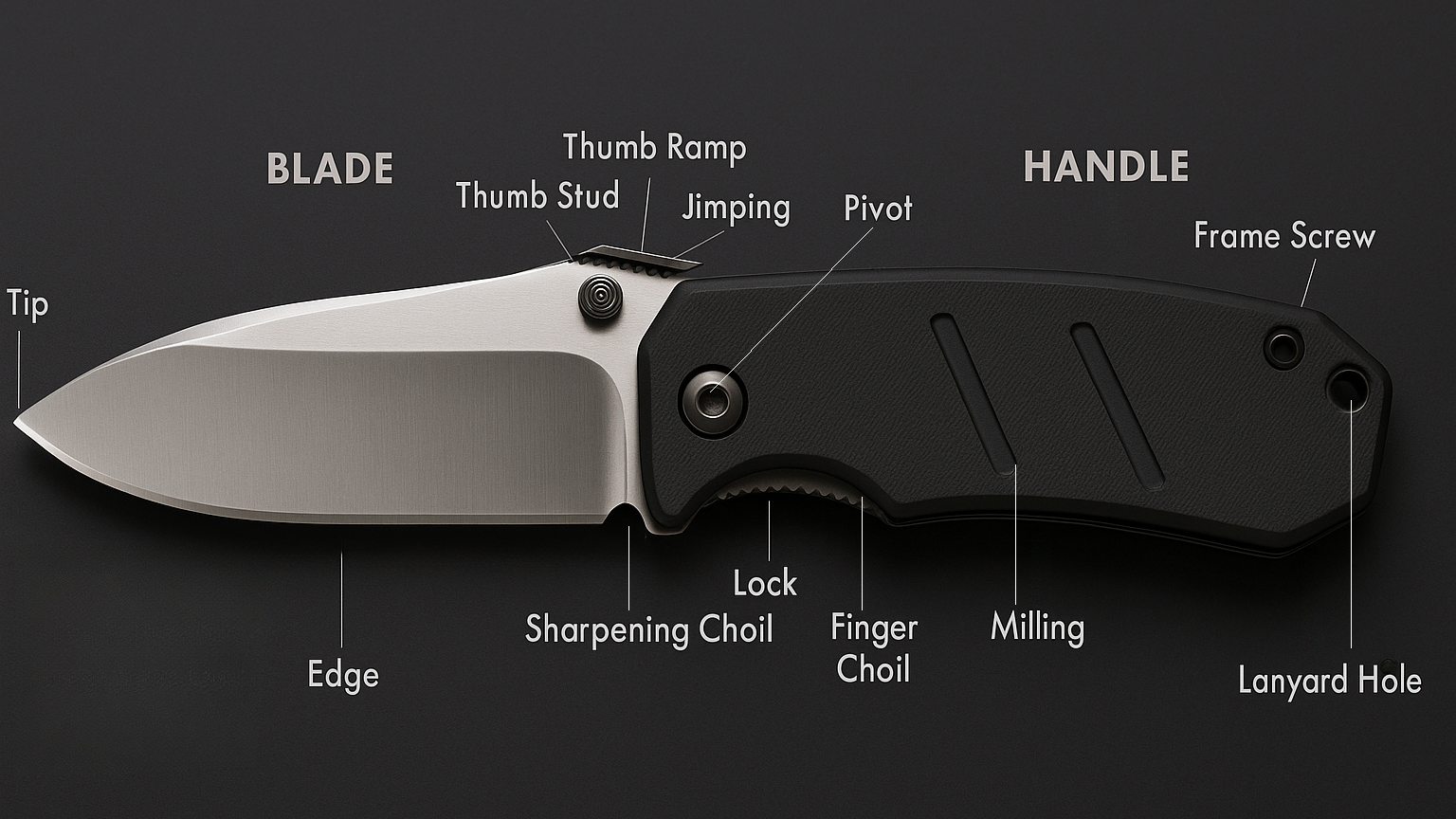 Houses the blade when closed and provides grip. Common materials include G10, micarta, aluminum, stainless steel, and titanium—each offering a different feel and durability level.